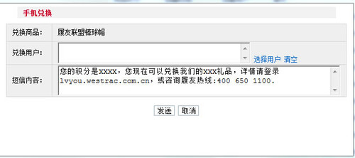 上傳的新積分商品,管理員可以給用戶手機(jī)發(fā)送兌換商品的通知,選擇發(fā)送的用戶,短信內(nèi)容為系統(tǒng)自動(dòng)提取,其內(nèi)容可以再次修改。