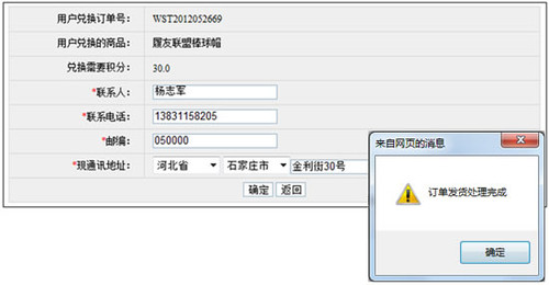 如會(huì)員想要兌換此商品,點(diǎn)擊“立即兌換”,進(jìn)入兌換頁(yè)面,該頁(yè)面顯示出兌換的商品及所需積分,并需要會(huì)員確認(rèn)送貨信息。點(diǎn)擊“提交”即完成兌換,并生成兌換訂單。