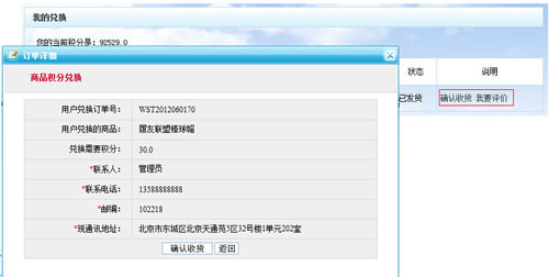 商品收貨:兌換訂單發(fā)完貨后,由會(huì)員確認(rèn)收貨,會(huì)員確認(rèn)收貨后即此訂單交易完成。在一定時(shí)期內(nèi)如會(huì)員未做收貨確認(rèn),管理員可修改收貨狀態(tài),完成訂單交易。
