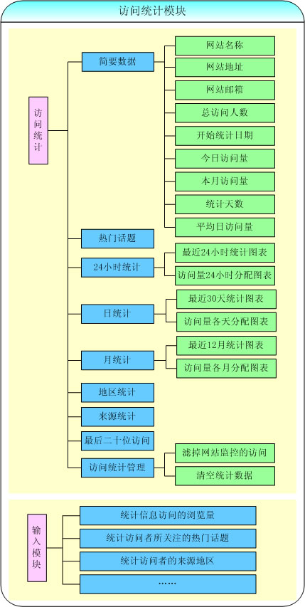 訪問統(tǒng)計模塊由簡要數(shù)據(jù)、熱門話題、24小時統(tǒng)計、日統(tǒng)計、月統(tǒng)計、地區(qū)統(tǒng)計、來源統(tǒng)計、最后二十位訪問、訪問統(tǒng)計管理等欄目組成。下面對這些功能逐一進行介紹: