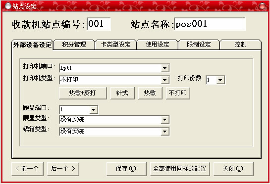 “外部設(shè)備設(shè)定”選項(xiàng),此窗口主要是設(shè)定一些前臺(tái)連接的外部設(shè)備,打印機(jī):默認(rèn)為沒(méi)有安裝打印機(jī),可以根據(jù)情況選擇“熱敏”,“針式”,錢箱類型:默認(rèn)為沒(méi)有安裝,如果連接了錢箱,則選擇“由POS58控制”即可,