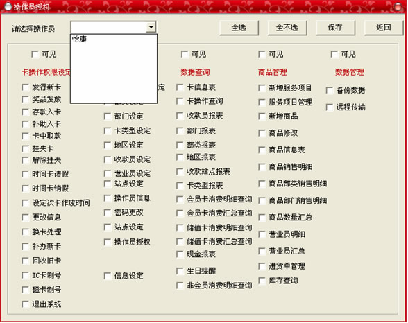 此菜單的主要功能是:在上面窗口中添加了不同的操作員信息,然后通過(guò)此菜單來(lái)對(duì)不同的操作員賦予不同的權(quán)限,選擇操作員后,可以點(diǎn)“全選”按鈕選擇所有的選項(xiàng),如果只想給某用戶符一部分權(quán)限,則在下面的選項(xiàng)中選擇,打“√”的為此用戶的權(quán)限,設(shè)置完畢后點(diǎn)“保存“按鈕,操作完畢點(diǎn)“返回”按鈕退出。