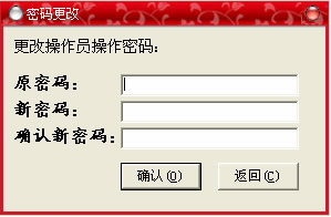 出現(xiàn)如上窗口后,依次根據(jù)各個(gè)提示輸入原密碼及新改密碼,點(diǎn)“確認(rèn)”按鈕即可,操作完畢后點(diǎn)“返回”退出。