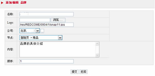 圖上可以添加品牌的名稱(chēng)logo圖片,公司和要顯示的節(jié)點(diǎn)位置(節(jié)點(diǎn)是事先添加好的,用戶(hù)之間選擇即可),對(duì)品牌的具體的說(shuō)明以及在品牌列表中顯示的位置。添加完這些信息以后,點(diǎn)擊添加按鈕,即可添加了一個(gè)品牌。